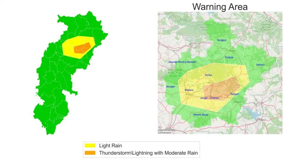 पूर्वानुमान के अनुसार, जांजगीर-चांपा, रायगढ़ और कोरबा में गरज-चमक के साथ 30 से 40 किलोमीटर प्रतिघंटा की रफ्तार से हवाएं चल सकती हैं और मध्यम बारिश हो सकती है। इसके अलावा बलौदा बाजार, बिलासपुर, जशपुर, गौरेला-पेंड्रा मरवाही, मुंगेली, सुरगुजा और सूरजपुर जिलों में हल्की वर्षा दर्ज होने के आसार हैं।