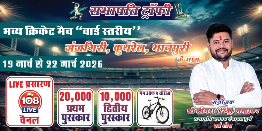 दुर्ग जनपद क्षेत्र क्रमांक 19 में खेल का जोश इन दिनों चरम पर है। 19 से 22 मार्च 2026 तक आयोजित होने वाली “सभापति ट्रॉफी” वार्ड स्तरीय क्रिकेट प्रतियोगिता में जंजगिरी, कुथरेल और भानपुरी की मजबूत टीमें एक-दूसरे से भिड़ेंगी। यह चार दिवसीय भव्य टूर्नामेंट युवा खिलाड़ियों के लिए अपनी प्रतिभा दिखाने का शानदार मंच साबित होगा।