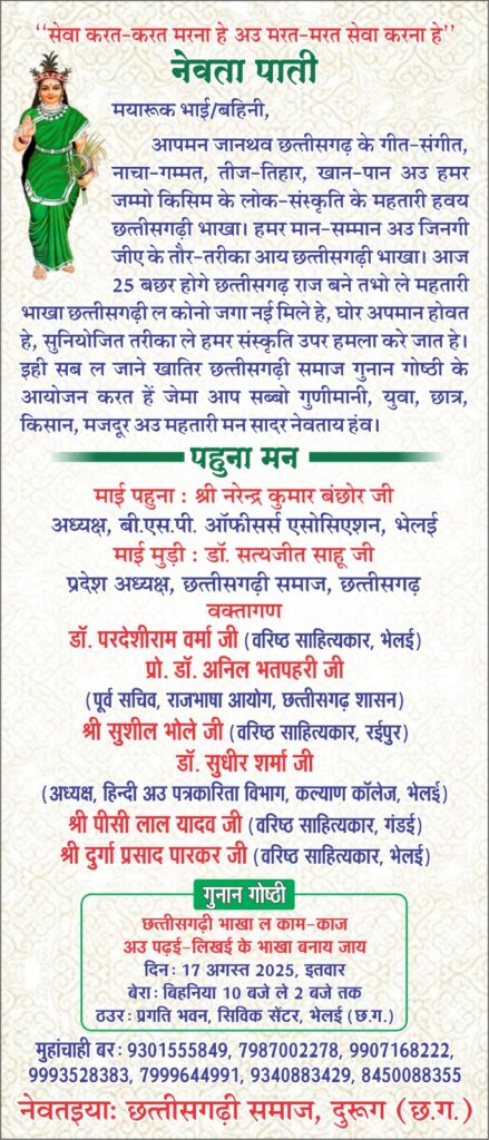छत्तीसगढ़ को निर्माण हुए 25 साल होने जा रहा है लेकिन यहां की प्रमुख रूप से बोले जाने वाली भाषा छत्तीसगढ़ी को अभी तक राजभाषा का दर्जा नहीं मिल पाया जिसको लेकर छत्तीसगढ़ी समाज के तत्वाधान में प्रगति भवन सिविक सेंटर सेक्टर 6 भिलाई में गुनान गोष्ठी 17 अगस्त दिन रविवार को सुबह 10 बजे से शाम 4 बजे तक आयोजित की गई है.